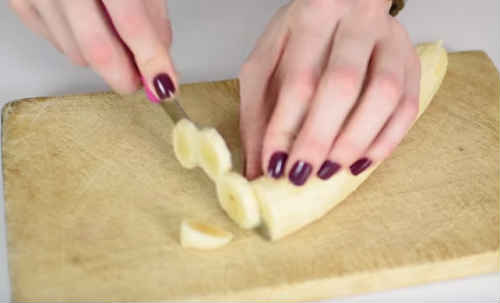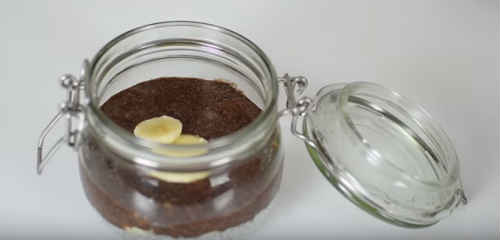 Залийте темним, шоколадним шаром. заповніть банку доверху, чергуючи білий і шоколадний шари з шматочками банана.