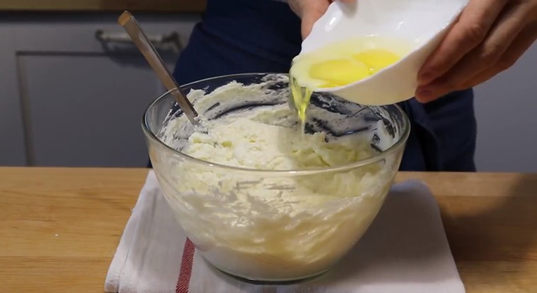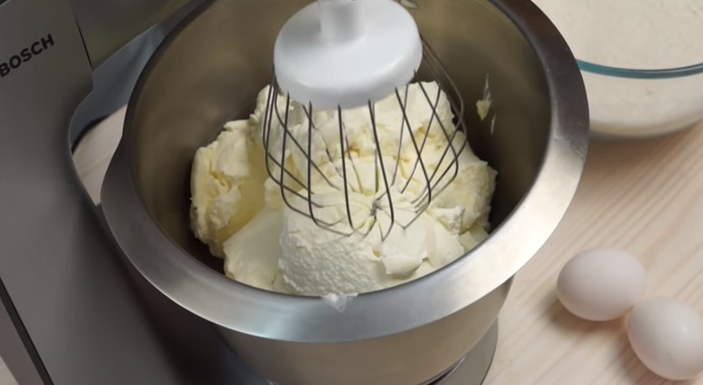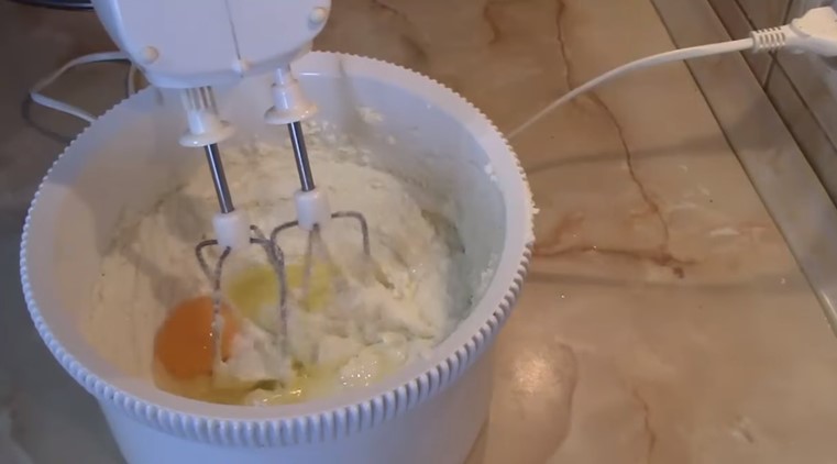 2. Сир протерти до кремової консистенції. Збити з цукром до його повного розчинення. Ввести по одному яйця, продовжуючи працювати міксером.
