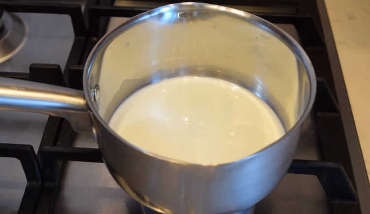 6. Молоко злити в кухлик і закип’ятити. Зняти з вогню і через 2-3 хвилини ввести віджатий желатин. Перемішати до його повного розчинення.