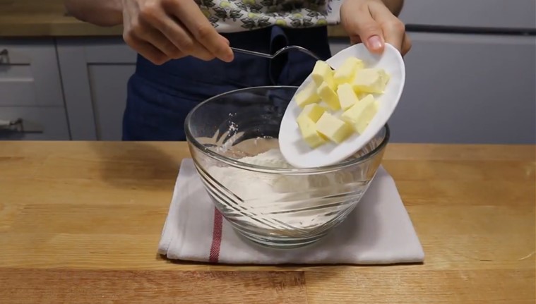 2. Додати цукор і тепле вершкове масло. Руками розім’яти суміш до утворення вологою однорідної крихти.