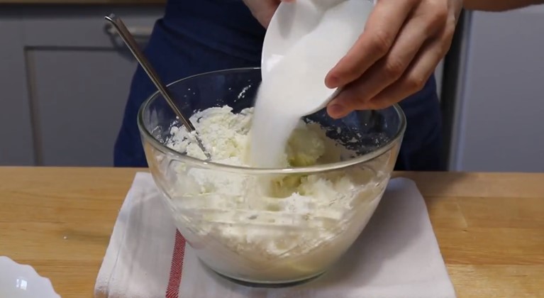 4. Для начинки розтерти сир з сиром, всипати цукор і збити масу до його розчинення.
