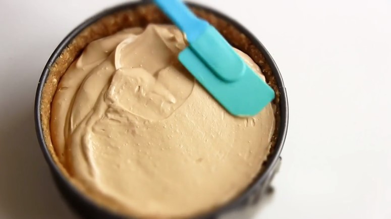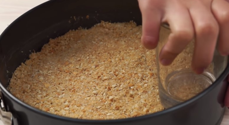1. Печиво подрібнити, додати до нього м’яке масло і перетерти у вологу, пухку крихту. Викласти її на дно форми і утрамбувати. Поставити в холодильник хвилин на 20.