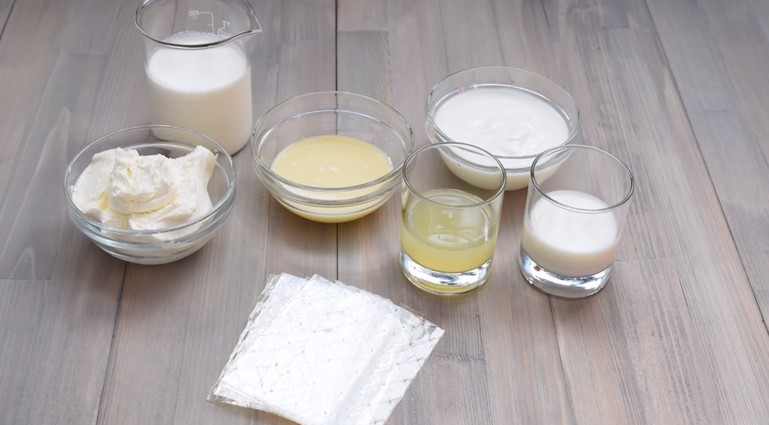 2. Желатин залити водою на півгодини. Сир збити зі згущеним молоком до однорідності. Підготовлений желатин прогріти в мікрохвильовій печі до сиропного стану. Змішати спочатку з частиною крему, потім ввести цю масу у весь сир.