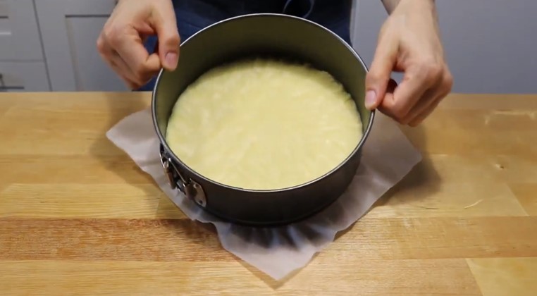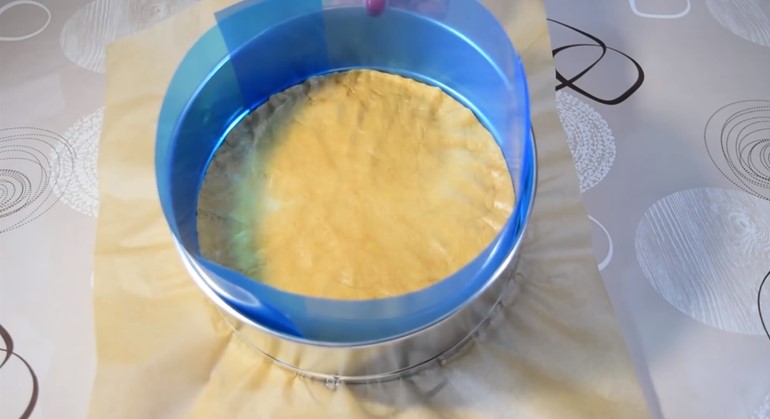 2. Тісто розкачати і викласти на дно рознімної форми 22-24 см, поставити в холодильник як мінімум на 40 хвилин.