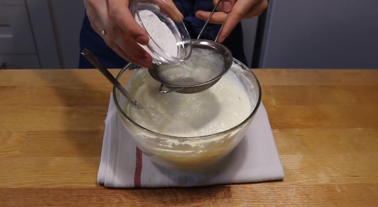 5. Додати сметану, лимонний сік, яйця по одному, продовжуючи збивати.