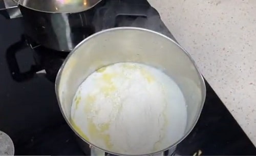 Влийте в каструлю молоко, засипте цукровий пісок, покладіть масло. Поставте на тихий вогонь растапливаться. Далеко не йдіть, контролюйте процес, помішуючи. Молоко має закипіти.