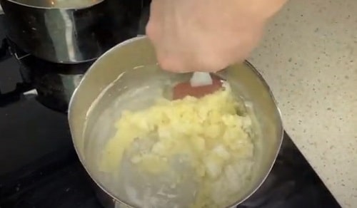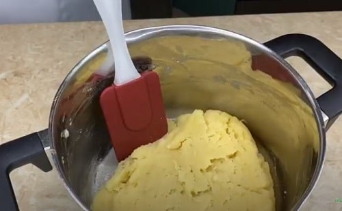 Першу хвилинку замішуйте, не знімаючи з вогню, потім вимкне конфорку. Продовжуйте вимішувати вміст, поки не вийде густий заміс. Відставте, щоб маса охолола.