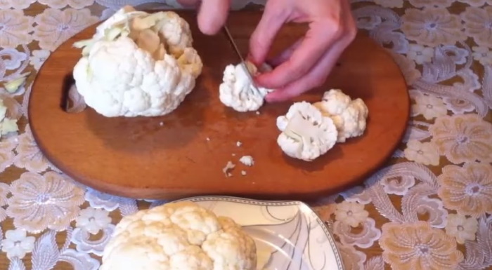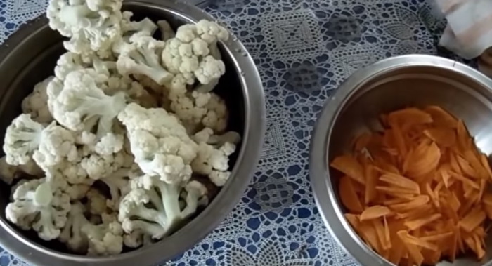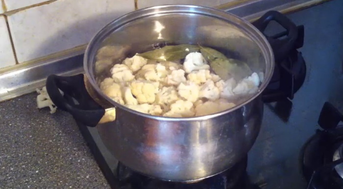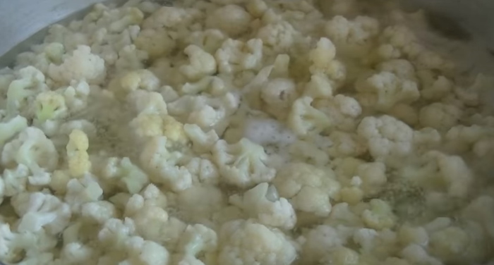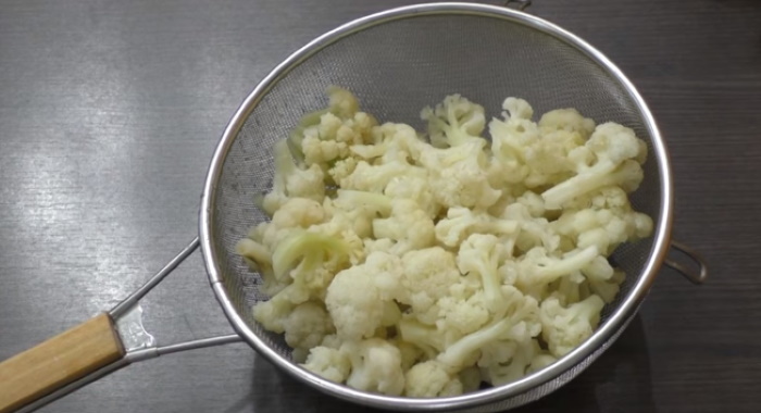 1. Розібрану на суцвіття головку капусти опускаємо в злегка підсолений окріп і бланшируем після закипання не більше п’яти хвилин. Потім відкидаємо овочі на друшляк, щоб стекла зайва рідина, а продукт охолодився.