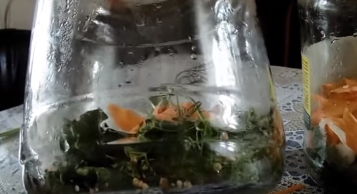 2. Траву перемываем і стряхиваем від надлишків рідини. Укладаємо її разом зі спеціями на дно чистої банки. Зверху кидаємо 1/3 моркви, перцю і часнику.