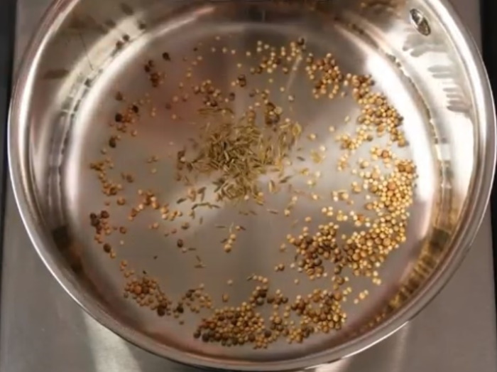 1. Додайте насіння коріандру, гірчиці і кмину в сотейник. Підсмажте насіння на середньому вогні без масла, обертаючи сковороду, поки насіння не стануть ароматними і злегка підрум’яненими. Цей процес займе близько 2 хвилин.