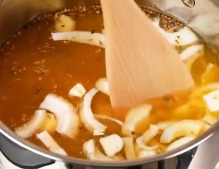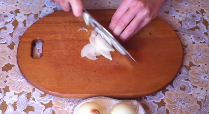 5. Поки капуста вариться, нам потрібно нашаткувати головки цибулі тоненькими півколами. А також перемішати настоявшуюся моркву і відміряти 200 грам.