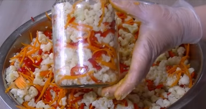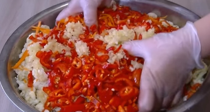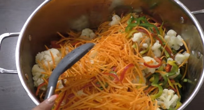 2. Коли суцвіття злегка охолонуть, до них додаємо тонку морквяну соломку, нашатковану півколами болгарський перець, колечка чилі і пропущений через чеснокодавку часник. Овочі ретельно, але вкрай акуратно перемішуємо.