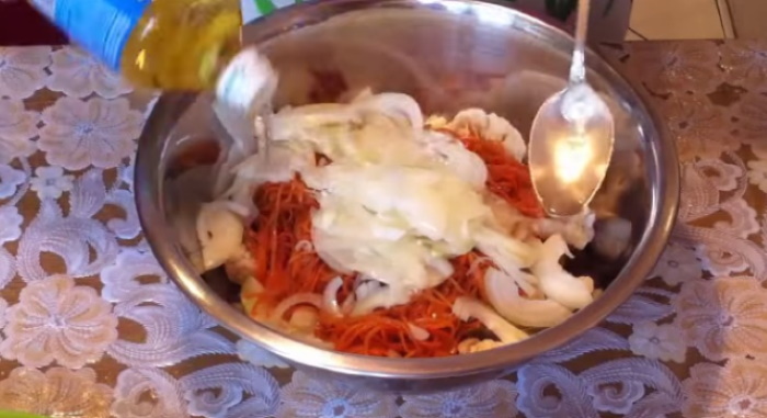 6. У глибокій мисці змішаємо всі овочеві заготовки, заправити салат олією. Така смакота може бути з’їдена відразу ж або готовий делікатес перекладають у пластиковий контейнер, закривають і зберігають у холодильнику не більше 14 діб.