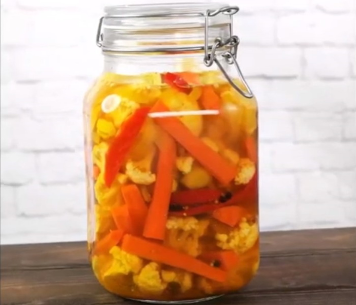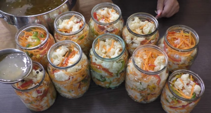 4. Водичку з настоялися овочів зіллємо в каструльку, додати в неї сіль і цукор (на літр – за ст. ложці того і іншого). Доводимо суміш до кипіння, додамо столовий оцет за смаком і готовим маринадом заллємо овочеву суміш. Після того, як закотимо цей делікатес, перевернемо тару і залишимо в цьому положенні до повного остужения продуктів.