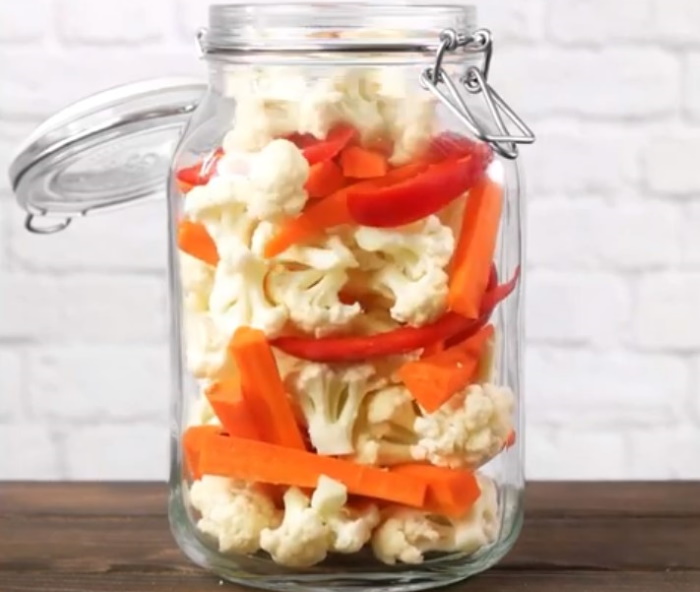 3. Укладіть суцвіття капусти, моркву і солодкий перець в 2-літрову банку або пластиковий контейнер.