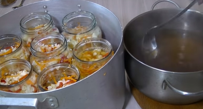 6. 700 мл тару будемо стерилізувати 20 хвилин, літрову на 5 хвилин довше. Гарячу закуску герметично закатуємо і прибираємо під шубу на добу.