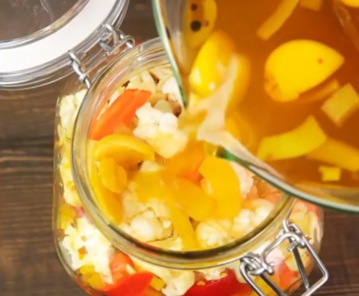 4. Влийте гарячий маринад до овочів. Дайте охолонути до кімнатної температури, а потім накрийте і поставте в холодильну камеру на 2 діб до дегустації. Овочі можуть зберігатися до двох тижнів.