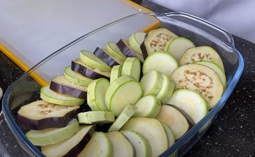Трохи промаслити дно і боки жароміцної форми. Викладіть кружечки кабачків і баклажанів ланцюжком, як на фото. Заповніть ними центр форми, якщо трохи нарізки залишилося. Трохи поперчіть.