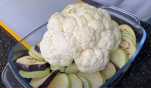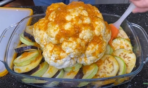 Якщо хочете красиво подати блюдо, викладіть на плоску тарілку трохи салатного листя, збризніть їх бальзамічним оцтом. Покладіть трохи помідорів чері або просто часточок інших томатів. На них красиво розташуйте кружечки баклажанів, кабачків, розібрану на суцвіття капусту.