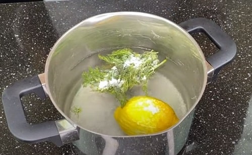 Налийте в каструлю воду, поставте на плиту. Киньте половинку лимона, пучок кропу, посоліть. Гілочки кропу раджу зв'язати, щоб зручніше потім витягувати.