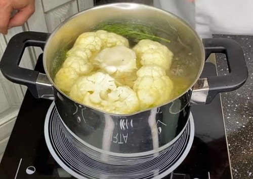 - Поділіть качан на окремі суцвіття, відваріть в підсоленій воду протягом 2-3 хвилин. Відкиньте, щоб стекла рідина, трохи підсушіть.
