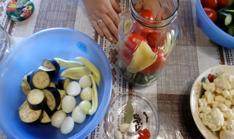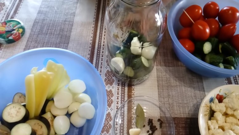 1. Всі овочі ретельно миємо. Огірки нарізаємо кільцями до 3 см завтовшки, томати для маринаду розрізаємо на 4 частини, дрібноплідні помідори просто наколюємо зубочисткою в районі плодоніжки. Капусту розбираємо на суцвіття, які добре прополіскуємо від піску. Цибулинки беремо невеликого розміру і розрізаємо вздовж. У паприки зрізаємо плодоніжку, видаляємо насіння і ріжемо стручок уздовж на 6-8 частин. Тонкий баклажани нарізаємо кружечками, більш потовщений плід краще порізати півмісяцем.