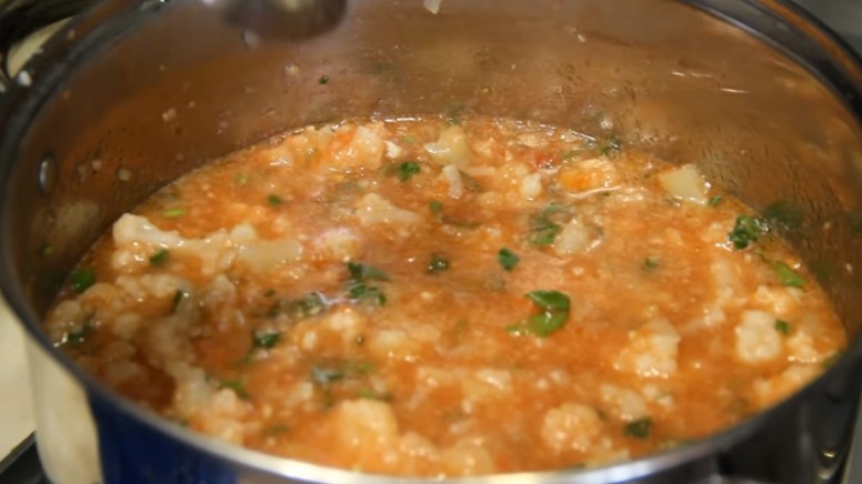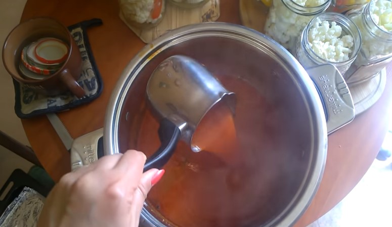 6. Коли маринад почне закипати, в ємність викладаються відварені заздалегідь суцвіття, змішуються з томатною масою і проварюються на повільному вогні протягом 20 хвилин.