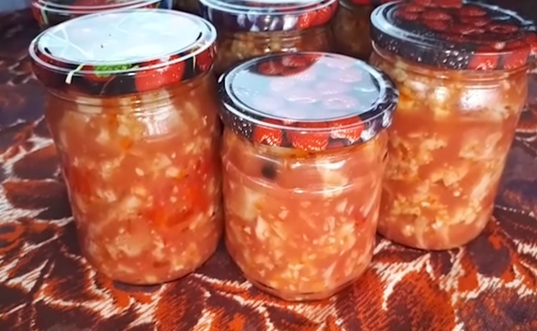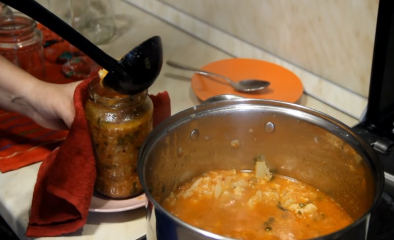 4. Готову закуску розкладаємо по заздалегідь пропареної склотарі, заповнюючи її до самого верху. Потім щільно закриваємо прокип’яченими кришками, перевертаємо з ніг на голову і вкриваємо пледом на добу.