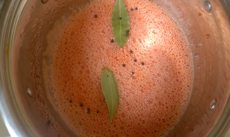 1. Беремо велику жароміцну ємність, в яку переливаємо томатний сік. Якщо такого немає, то візьміть половину літра томатпасты і розведіть її в воді, щоб вийшла задана норма. Далі додаємо сіль, цукор, масло і оцет, включаємо вогонь, чекаємо закипання і варимо 10 хвилин.