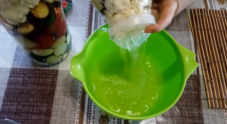 6. З овочів зливаємо воду і заливаємо їх киплячою заливкою. Заповнену склотару герметично укупориваем, ставимо з ніг на голову і залишаємо під товстою ковдрою на добу.