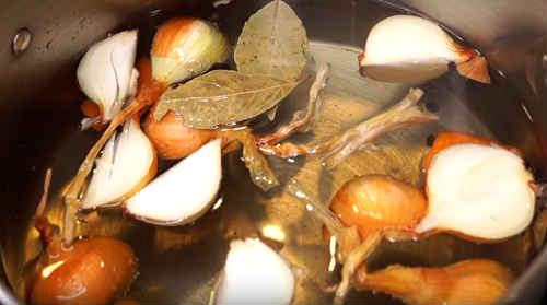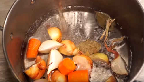 Перш за все, зробіть відвар. Наріжте на чотири частини цибулинки, не очищаючи від лушпиння, крупно поділіть морквину. Складіть у каструлю, залийте водою.