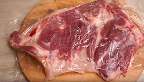 Зніміть плівку, м’ясо посоліть, поперчіть, розподіліть по поверхні роздавлений пресом часник. Втирайте спеції руками.