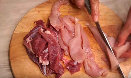 Зрізане м’ясо і грудку курки наріжте смужками.