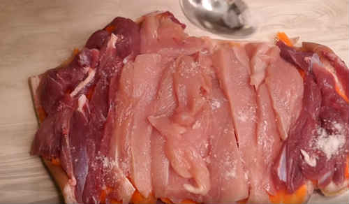 Розподіліть поверх смужок морквини. Знову посоліть і здобріть перчиком.