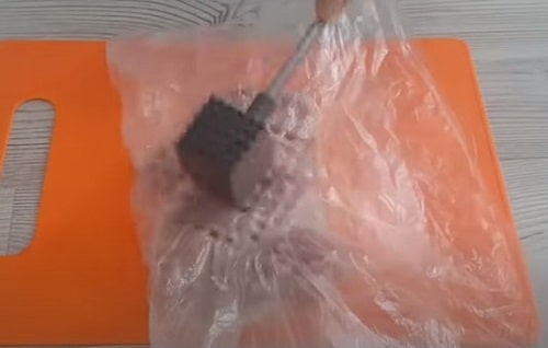 Відбийте кухонним молоточком, сховавши під плівку, щоб не летіли бризки.
