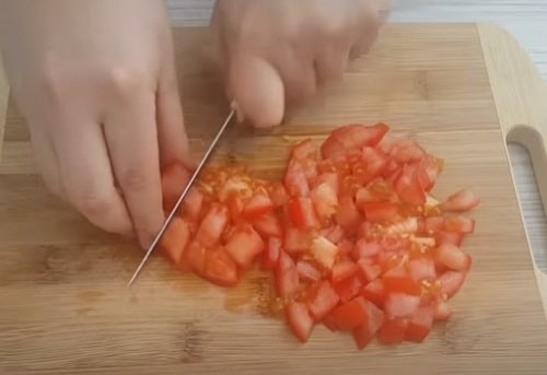 - Наріжте огірки брусочками, помідор покришіть кубиками.