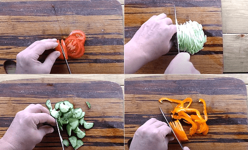 Наріжте кружечками помідори. Зробіть із огірків півкільця. У солодких перців видалити насінну коробку, м’якоть настрогайте соломкою. Аналогічно поріжте білокачанну капусту.