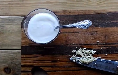 Одночасно займіться соусом. Перелийте в миску йогурт. Додайте по черзі рубаний часник.