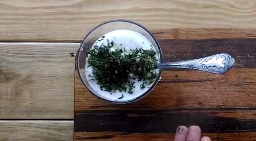 - Порубаєте гілочки петрушки, додайте в сметану. Роздушіть часникові зубчики пресом, відправте в соус. Посоліть, перемішайте. Залиште на столі на чверть години.