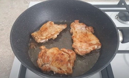 - Промийте курку, здобріть приправами з пакетика, підсолити, поперчіть. Смажте в олії на сковороді до готовності м’яса.