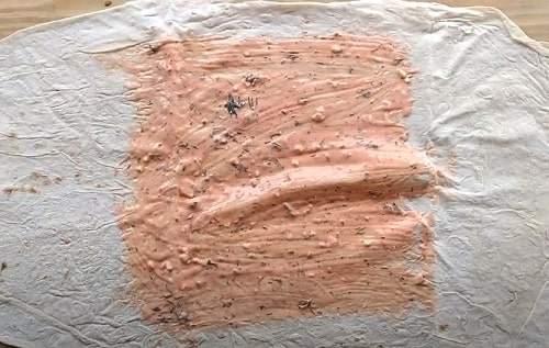 - Розгорніть лист лаваша, спочатку змастіть майонезом, потім кетчупом. Використовуйте половину від заявленої кількості.