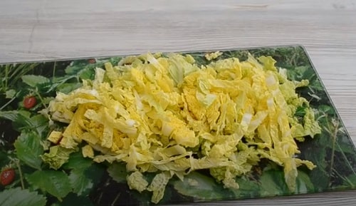 - Листя пекінської капусти обполосніть, поділіть на 2-3 частини.