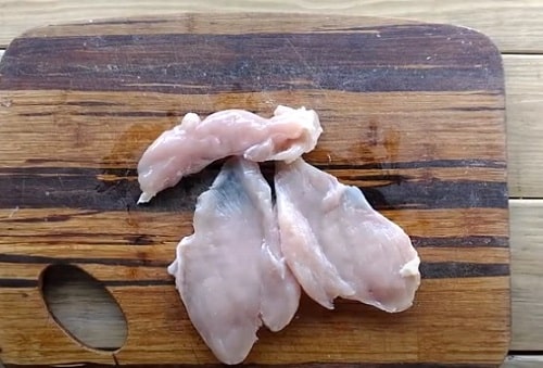 - Видаліть з грудки шкірку, якщо вона є, вирізати кісточку. М’якоть поріжте невеликими кубиками.