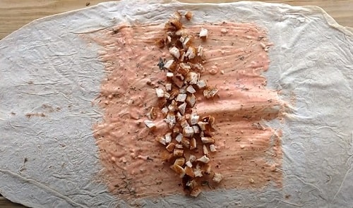 - Викладіть на край лаваша курку і підготовлені овочі. Низка шарів за вашим бажанням.