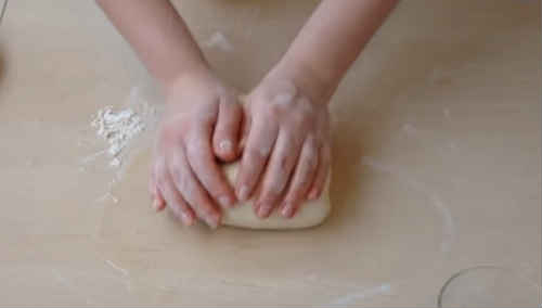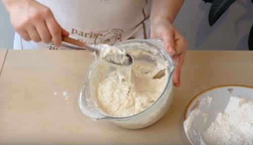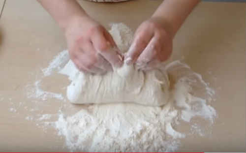 Залишки борошна насипте на робочу поверхню столу. Розмішайте в мисці тісто, викладіть його на стіл, на борошно. Вимішуйте руками. Все у вас повинно піти 0,5 кг борошно, заявлених у рецепті. Якщо в кінці руки ще продовжують прилипати, додайте ще небагато.