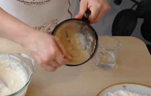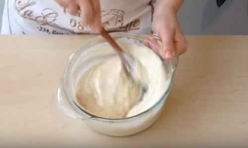 Окремо в чашці, підготуйте швидкі дріжджі. Залийте їх теплою водою, додайте ложечку цукру, перемішайте до розчинення кристалів. Засипте ложку борошна, знову розмішайте масу.