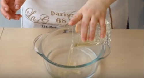 Зігрійте воду, зробіть її трохи тепліше кімнатної температури. Влийте половину від вказаного в рецепті рослинного масла. Спеціально не відміряйте, лийте на око.