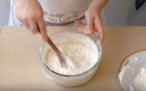 Посипте деяку кількість борошна. Замісіть ложкою тісто, трохи рідший, ніж на оладки. Постарайтеся розбити грудочки. Але якщо залишиться трохи крихітних грудочок, не переживайте, не витрачайте час на ідеальну консистенцію.