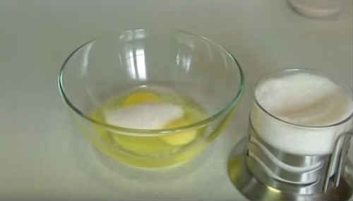 Одночасно, вбийте в миску яйця, додайте цукор.