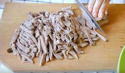 - Відваріть субпродукт, почистіть, поділіть соломкою.
